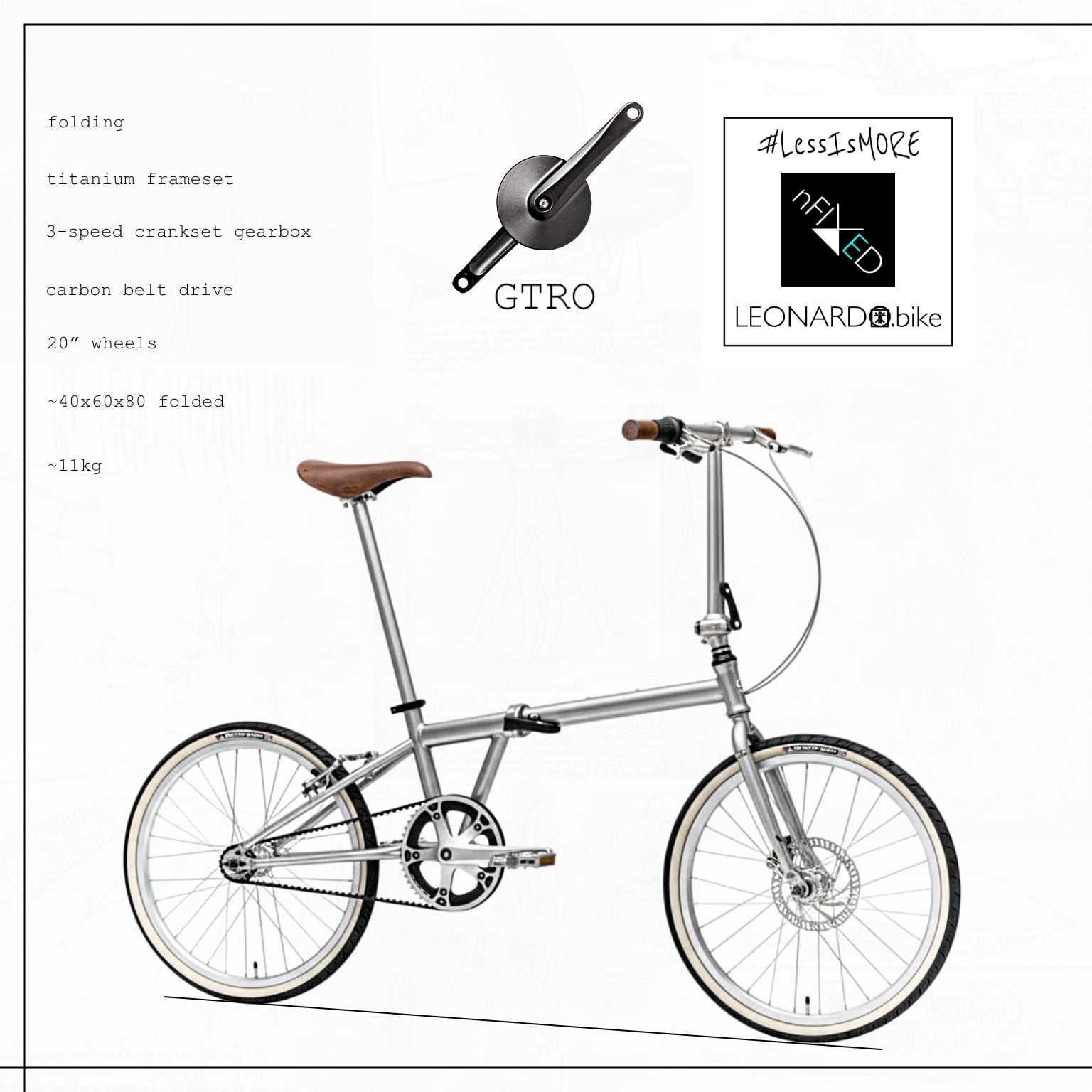 - The 3-SPEED GTRO FOLDI.LEO is a carefully built folding bike made to order in London using the newest parts. It offers smooth shifting with its 3-speed internal gears and can be upgraded to electric by changing the rear wheel with our KEYDE kit. Its strong, lightweight titanium frame folds small but rides like a full-size bike. It has aluminium rims, seat-post, and handlebars with sealed bearings, plus a quiet GATES carbon belt-drive (chain option also available). The bike uses 20" wheels and easy-to-maintain hybrid front disc brake and rear rim brake. It includes mounts for mudguards and racks if needed. External cables mean no special parts are required for maintenance or upgrades. Choose between a comfortable brown microsuede or black sport saddle and grips. It supports riders up to 110kg and folds down to about 40x70x80cm. We provide final photos before shipping and are happy to help with any custom requests.